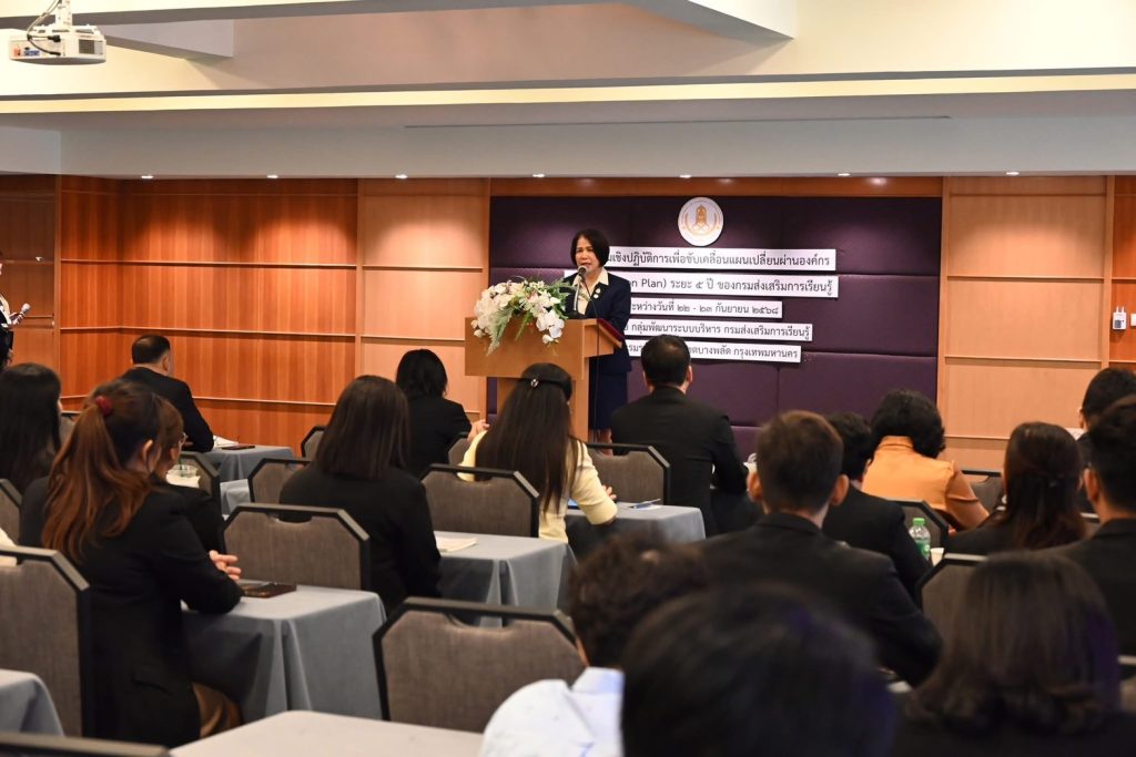 วันที่ 22 กันยายน 2568 นายธนากร ดอนเหนือ อธิบดีกรมส่งเสริมการเรียนรู้มอบหมายให้ นางยุพิน บัวคอม รองอธิบดีกรมส่งเสริมการเรียนรู้ ในฐานะผู้นำการบริหารการเปลี่ยนแปลง (Chief Change Officer : CCO) เป็นประธานการประชุมเชิงปฏิบัติการเพื่อขับเคลื่อนแผนเปลี่ยนผ่านองค์กร (OD Transition Plan) ระยะ 5 ปี ของกรมส่งเสริมการเรียนรู้ พร้อมทั้งบรรยายพิเศษ ในหัวข้อ OD Transition Plan ผู้ร่วมประชุม ประกอบด้วย ผู้อำนวยการกลุ่มศูนย์/ส่วนกลาง ผู้บริหารหน่วยงานการศึกษา บุคลากรจากกลุ่มศูนย์/ส่วนกลาง และเจ้าหน้าที่ผู้เกี่ยวข้อง จำนวน 115 คน การประชุมจัดขึ้นระหว่างวันที่ 22-23 กันยายน 2568 ณ โรงแรม รอยัล ริเวอร์ เขตบางพลัด กรุงเทพมหานคร