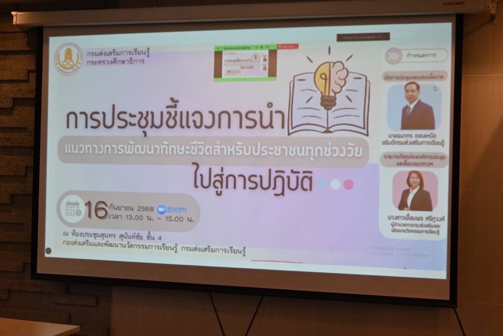 นางสาวเอื้อมพร ศรีภูวงศ์ ผู้อำนวยการกองส่งเสริมและพัฒนานวัตกรรมการเรียนรู้ ชี้แจงการนำแนวทางการพัฒนาทักษะชีวิตสำหรับประชาชนทุกช่วงวัยไปสู่การปฏิบัติและแผนขับเคลื่อนการดำเนินงานในระยะถัดไป โดยกล่าวถึงความสำคัญของทักษะชีวิต (Life Skills) ว่า มีความสำคัญอย่างยิ่งต่อการดำรงชีวิตของบุคคล การพัฒนาทักษะชีวิตช่วยให้บุคคลสามารถรับมือกับความท้าทายและปรับตัวต่อบริบทที่เปลี่ยนแปลงได้อย่างเหมาะสม ดังนั้น เพื่อให้การจัด ส่งเสริม และสนับสนุนการเรียนรู้ตลอดชีวิตเพื่อพัฒนาทักษะชีวิตสำหรับประชาชนทุกช่วงวัย จะช่วยตอบสนองต่อความต้องการที่หลากหลายและวิถีชีวิตที่เปลี่ยนแปลงไปของคนในโลกยุคใหม่ได้ และเป็นกลไกสำคัญในการวางแผน พัฒนาโปรแกรมการเรียนรู้ สื่อการเรียนรู้ การออกแบบกิจกรรมการเรียนรู้ ทรัพยากรการเรียนรู้และการประเมินการเรียนรู้ที่เหมาะสมกับแต่ละกลุ่มเป้าหมายได้อย่างทั่วถึงและมีประสิทธิภาพ