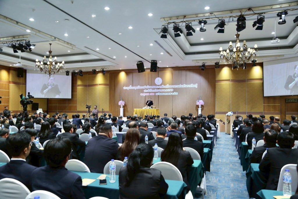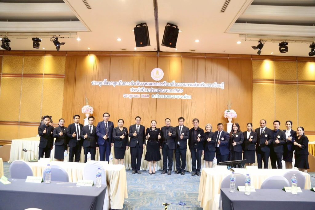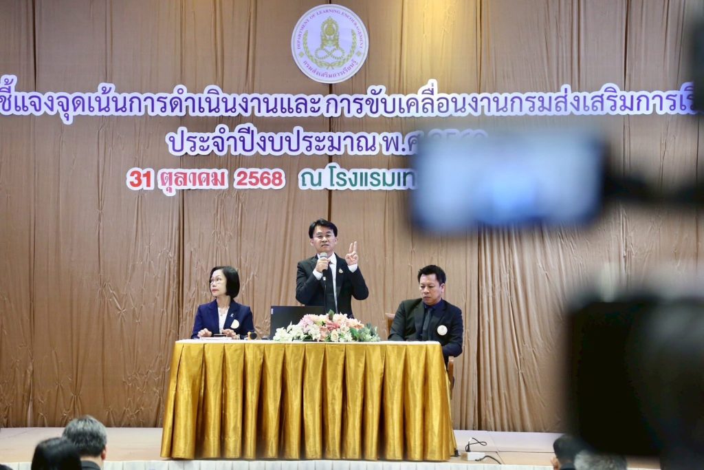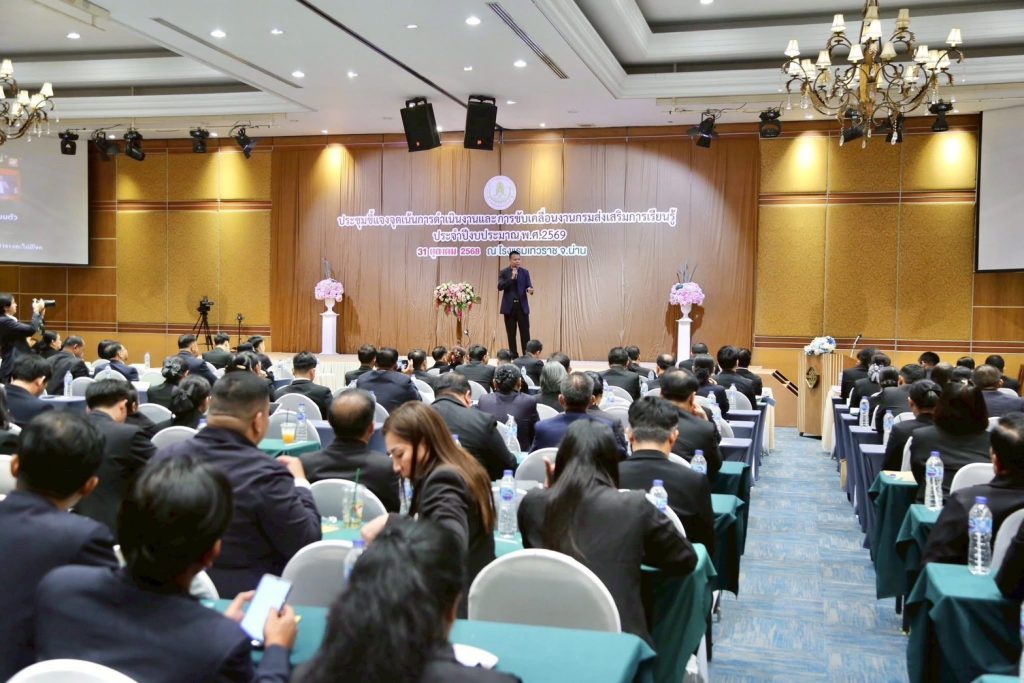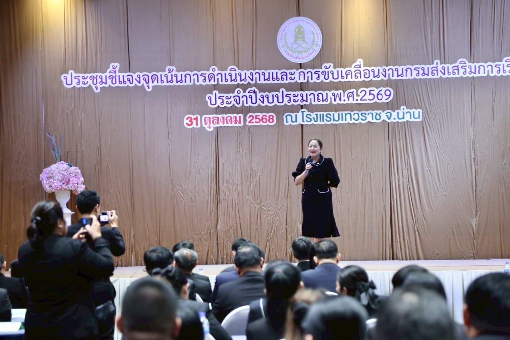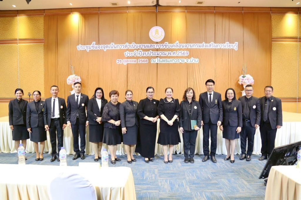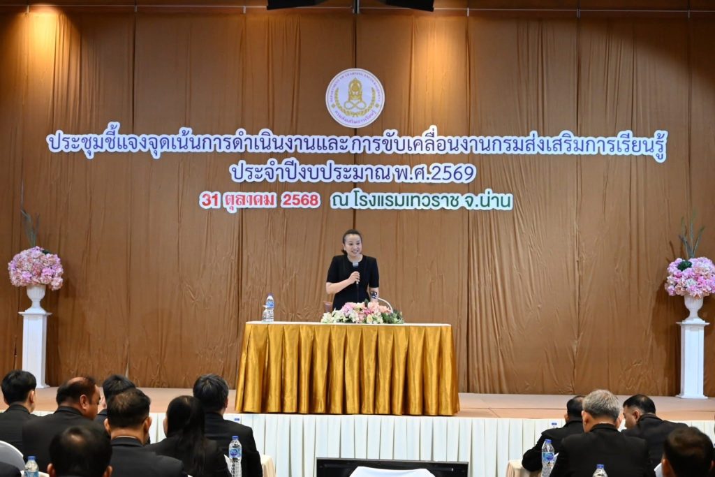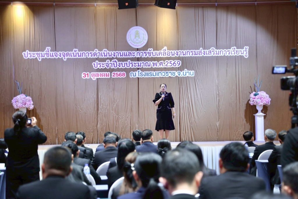 วันที่ 31 ตุลาคม 2568นางเกศทิพย์ ศุภวานิช อธิบดีกรมส่งเสริมการเรียนรู้ เป็นประธานการประชุมชี้แจงจุดเน้นการดำเนินงานประจำปีงบประมาณ พ.ศ. 2569 ณ โรงแรมเทวราช จังหวัดน่าน พร้อมร่วมประชุมผ่านระบบออนไลน์ โดยมีนางยุพิน บัวคอม และนายเอกราช ชวีวัฒน์ รองอธิบดีกรมส่งเสริมการเรียนรู้ รวมถึงผู้บริหารจากสำนักงานส่งเสริมการเรียนรู้ประจำจังหวัดทั่วประเทศเข้าร่วมประชุมอย่างพร้อมเพรียง