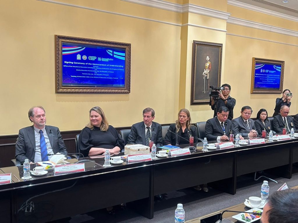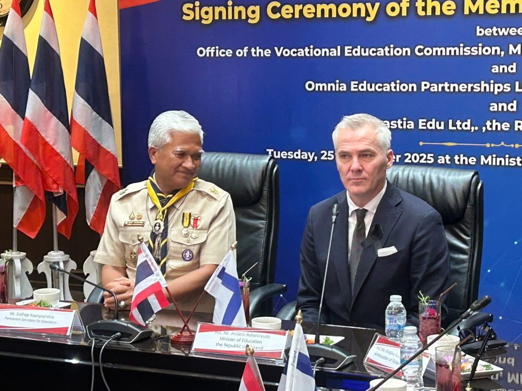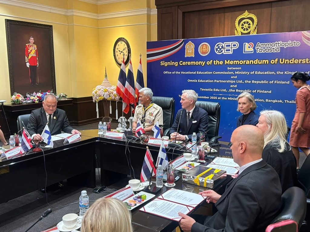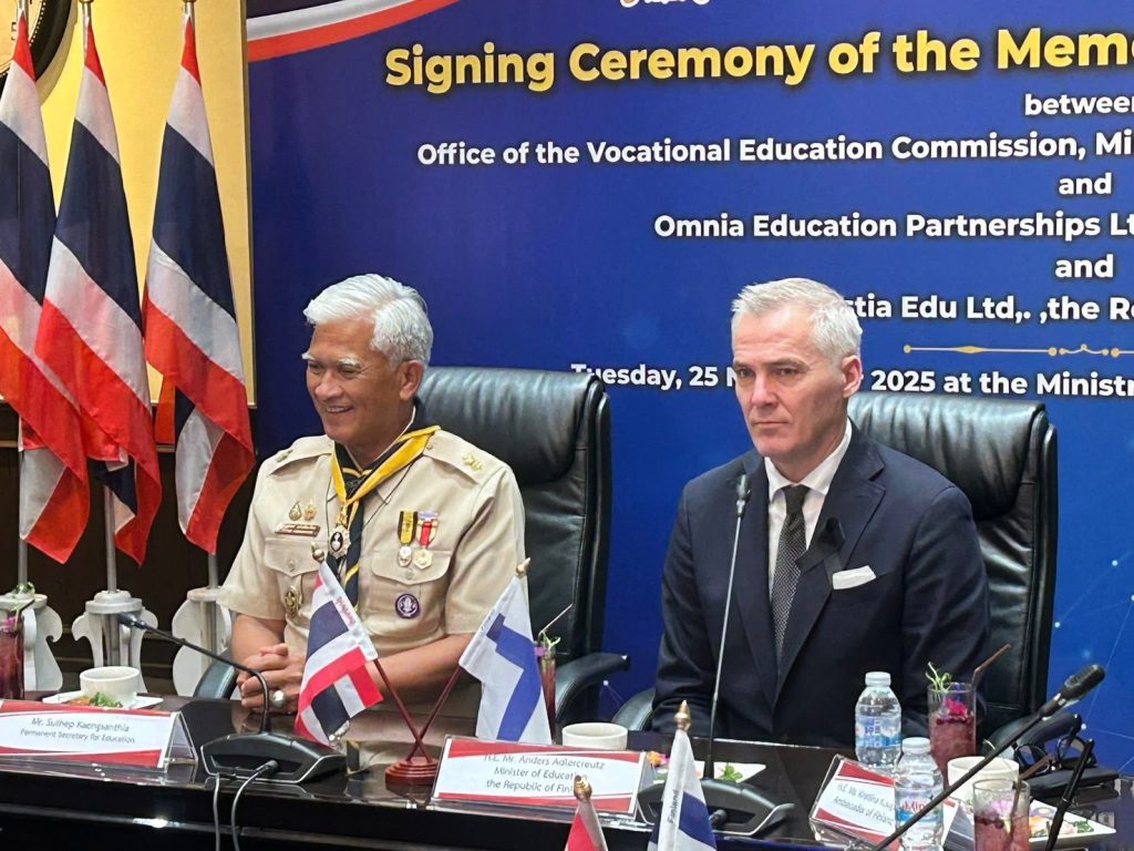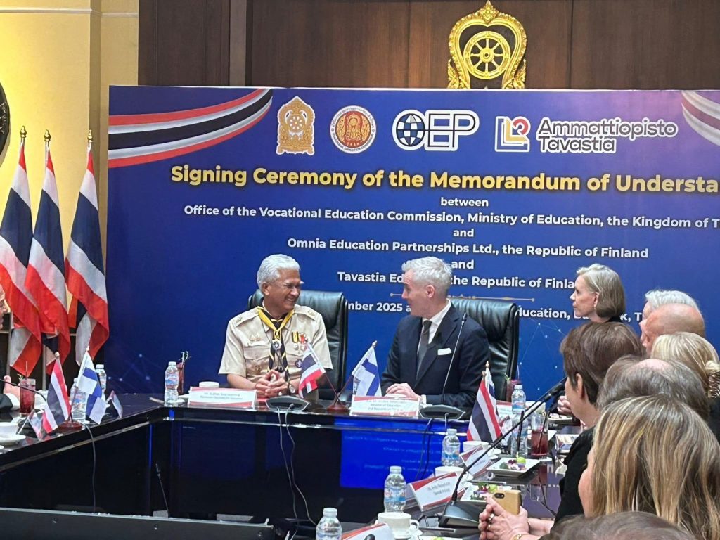 หลังการหารือ ทั้งสองฝ่าย นำโดย นายสุเทพ แก่งสันเทียะ ปลัดกระทรวงศึกษาธิการ และรัฐมนตรีว่าการกระทรวงศึกษาธิการสาธารณรัฐฟินแลนด์ ได้ร่วมเป็นประธานสักขีพยานในพิธีลงนามบันทึกความเข้าใจฯ เพื่อพัฒนาหลักสูตรอาชีวศึกษา ทักษะวิชาชีพ และเสริมสร้างความร่วมมือระหว่างสถานศึกษากับภาคอุตสาหกรรม ซึ่งนับเป็นก้าวสำคัญในการยกระดับคุณภาพการศึกษาและทักษะแรงงานของไทยต่อไป