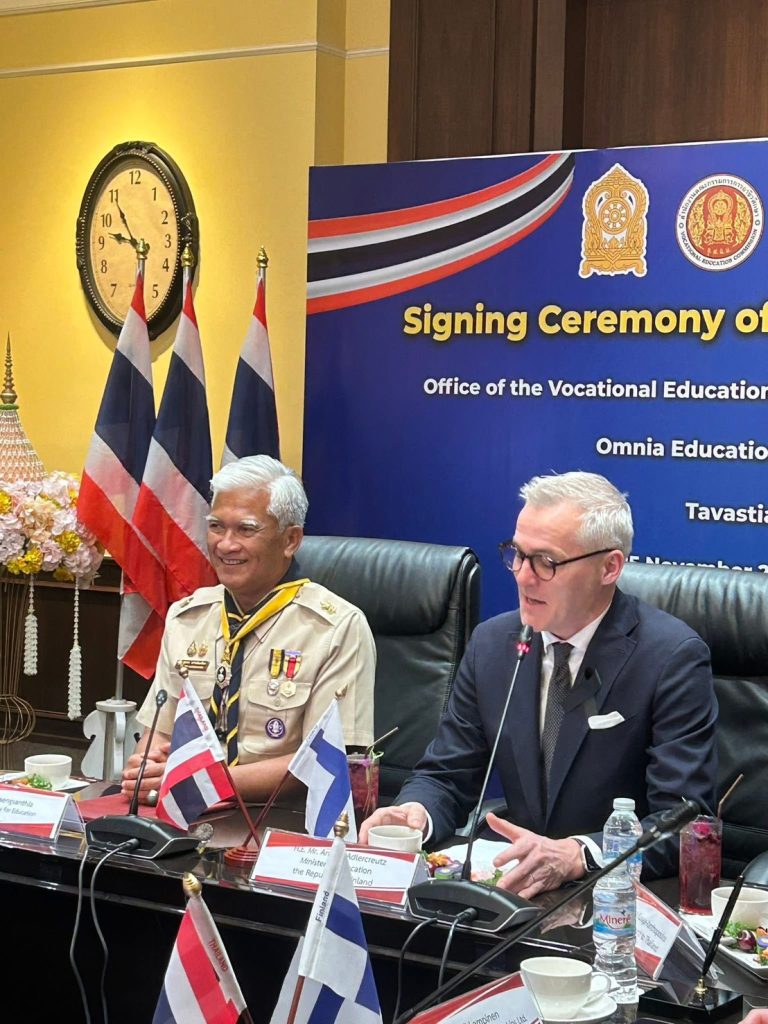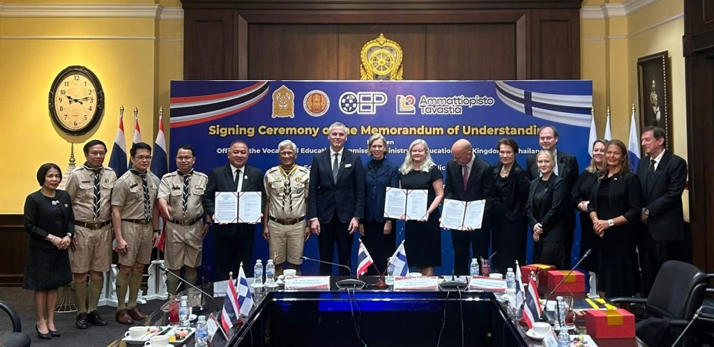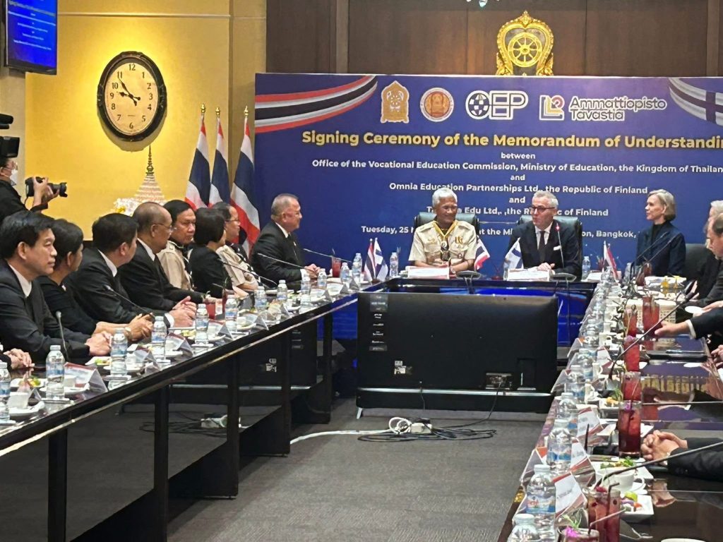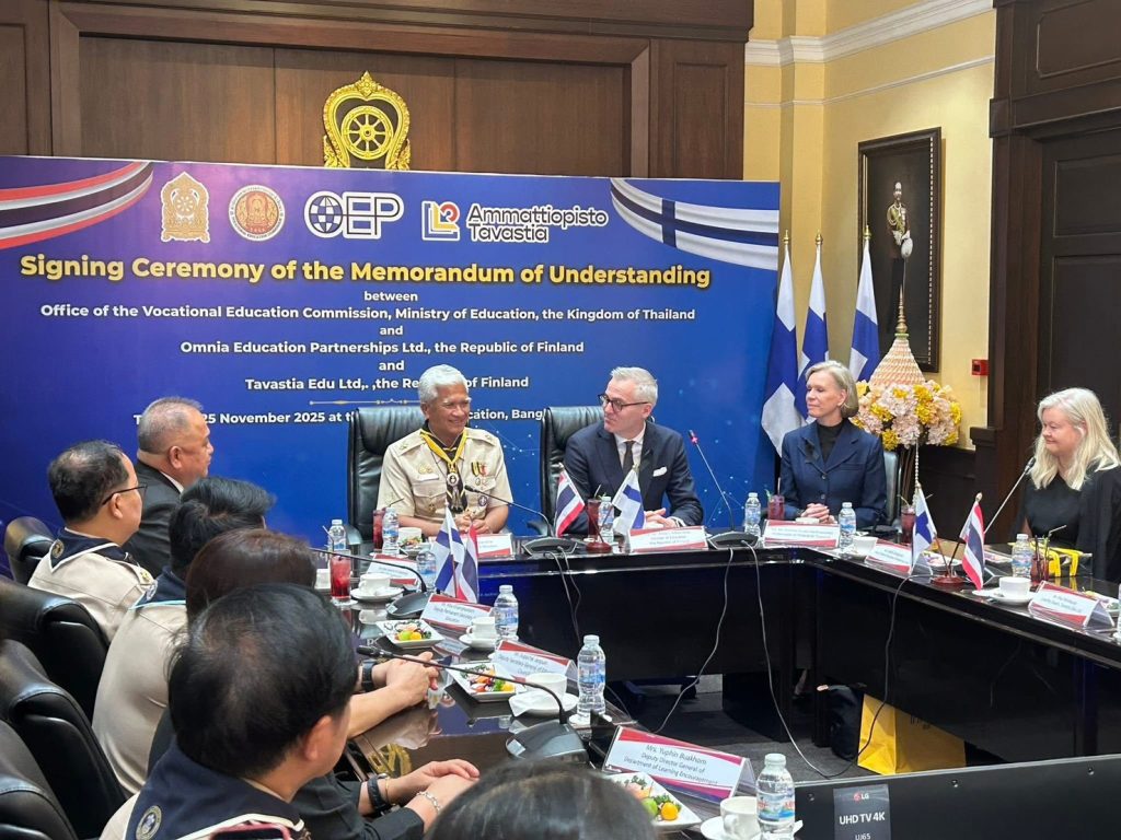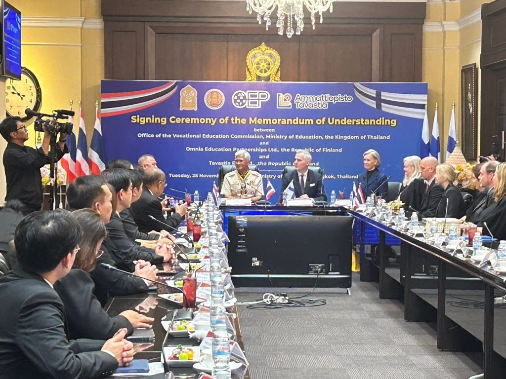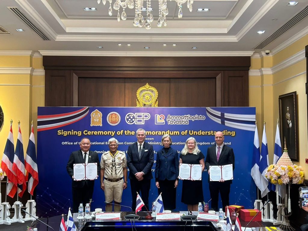 หลังการหารือ ทั้งสองฝ่าย นำโดย นายสุเทพ แก่งสันเทียะ ปลัดกระทรวงศึกษาธิการ และรัฐมนตรีว่าการกระทรวงศึกษาธิการสาธารณรัฐฟินแลนด์ ได้ร่วมเป็นประธานสักขีพยานในพิธีลงนามบันทึกความเข้าใจฯ เพื่อพัฒนาหลักสูตรอาชีวศึกษา ทักษะวิชาชีพ และเสริมสร้างความร่วมมือระหว่างสถานศึกษากับภาคอุตสาหกรรม ซึ่งนับเป็นก้าวสำคัญในการยกระดับคุณภาพการศึกษาและทักษะแรงงานของไทยต่อไป