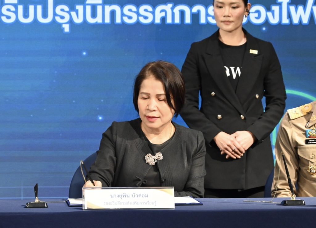 พิธีลงนามครั้งนี้ นางยุพิน บัวคอม รองอธิบดีกรมส่งเสริมการเรียนรู้ ได้รับมอบหมายจาก นางเกศทิพย์ ศุภวานิช อธิบดีกรมส่งเสริมการเรียนรู้ เป็นผู้ร่วมลงนามกับ กฟผ. โดยมี นายไชยยศ ตั้งวรกุลชัย ผู้ช่วยผู้ว่าการบริหารจัดการความยั่งยืน การไฟฟ้าฝ่ายผลิตแห่งประเทศไทย เป็นผู้มอบเงินสนับสนุนเพื่อปรับปรุงนิทรรศการเมืองไฟฟ้า ณ ห้องกิจกรรม ชั้น 2 ศูนย์การเรียนรู้ กฟผ. สำนักงานกลาง