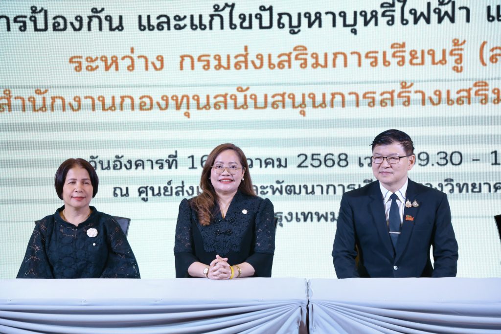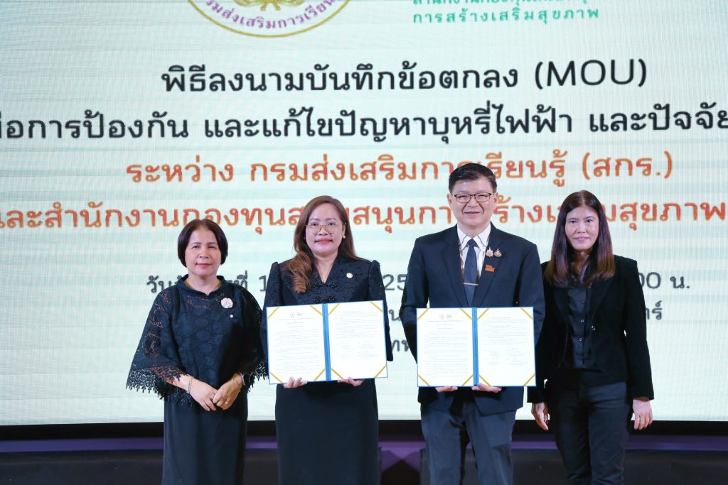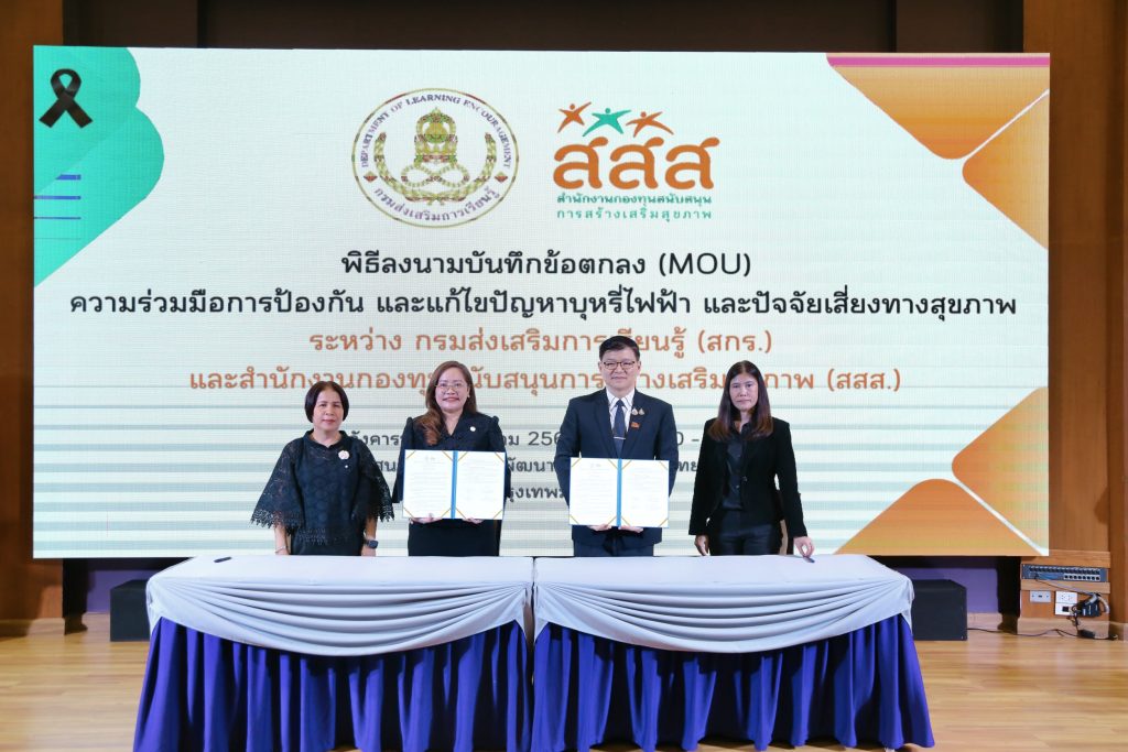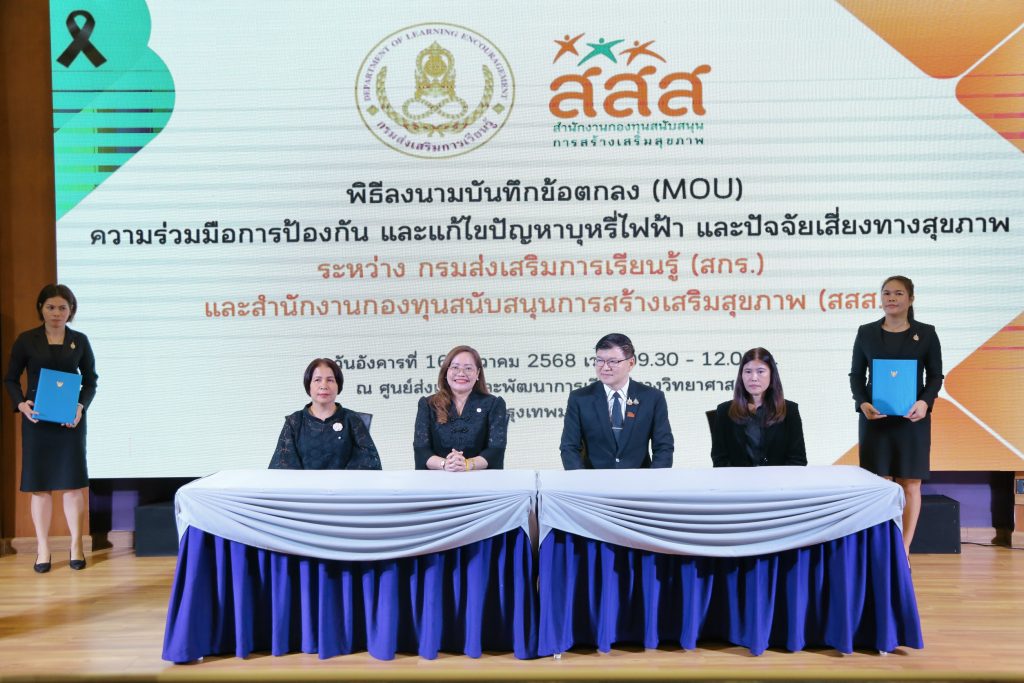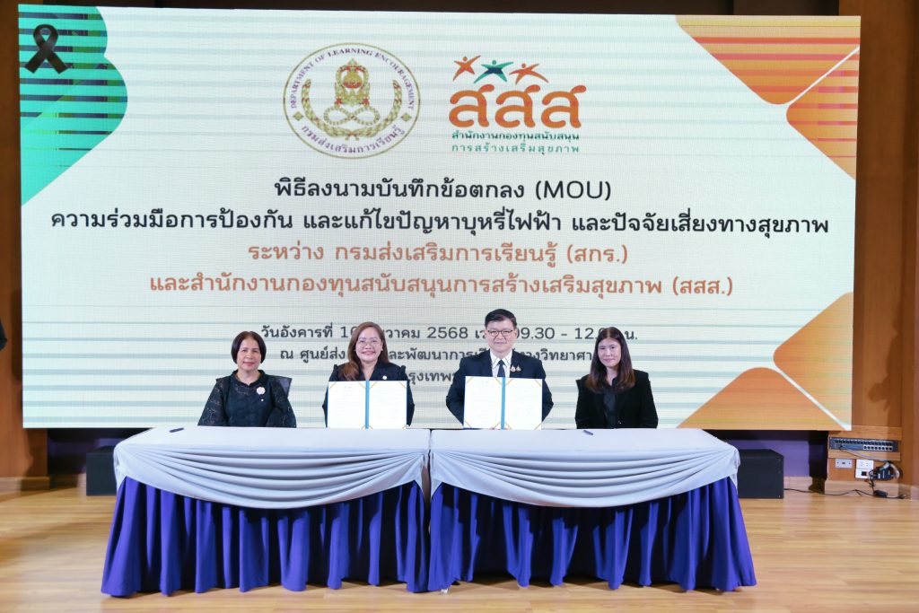 วันที่ 16 ธันวาคม 2568 กรมส่งเสริมการเรียนรู้ (สกร.) ร่วมกับ กองทุนสนับสนุนการสร้างเสริมสุขภาพ (สสส.) จัดพิธีลงนามบันทึกข้อตกลงความร่วมมือ (MOU) เพื่อขับเคลื่อนการป้องกันและแก้ไขปัญหาบุหรี่ไฟฟ้าอย่างเป็นระบบ ผ่านกระบวนการเรียนรู้ที่เข้าถึงง่าย เข้าใจได้จริง และสามารถนำไปใช้ในชีวิตประจำวัน โดยมุ่งสร้างสภาพแวดล้อมการเรียนรู้ที่ปลอดภัย และเสริมสร้างภูมิคุ้มกันด้านสุขภาวะให้แก่ผู้เรียนและประชาชนทุกช่วงวัยทั่วประเทศ