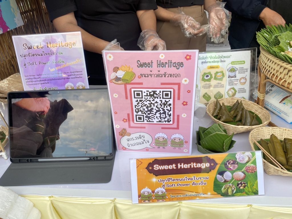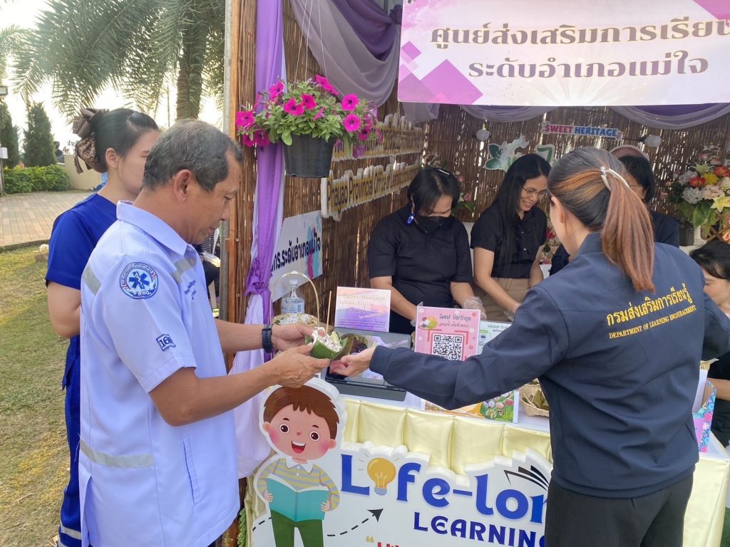 • สกร.ระดับอำเภอแม่ใจ นำเสนอบูธนิทรรศการ การถ่ายทอดเรื่องราวของ “ข้าวต้มหัวหงอก” ขนมไทยที่สืบทอดจากรุ่นสู่รุ่น ทำจากข้าวเหนียวสอดไส้หวานห่อด้วยใบตอง และเต็มไปด้วยความทรงจำแห่งความผูกพันของผู้คนในพื้นที่ นอกจากนี้ยังมีกิจกรรมส่งเสริมการอ่านผ่านสื่อเกี่ยวกับการทำขนม ทั้งใบความรู้ สูตร วิดีโอ ขั้นตอน และประวัติความเป็นมา เพื่อให้ผู้เข้าร่วมสามารถฝึกทักษะการอ่าน คิดวิเคราะห์ และนำข้อมูลไปลงมือปฏิบัติได้จริง ซึ่งเป็นการบูรณาการการเรียนรู้ให้สอดคล้องกับแนวคิด “อ่าน–ทำ–สร้างรายได้”