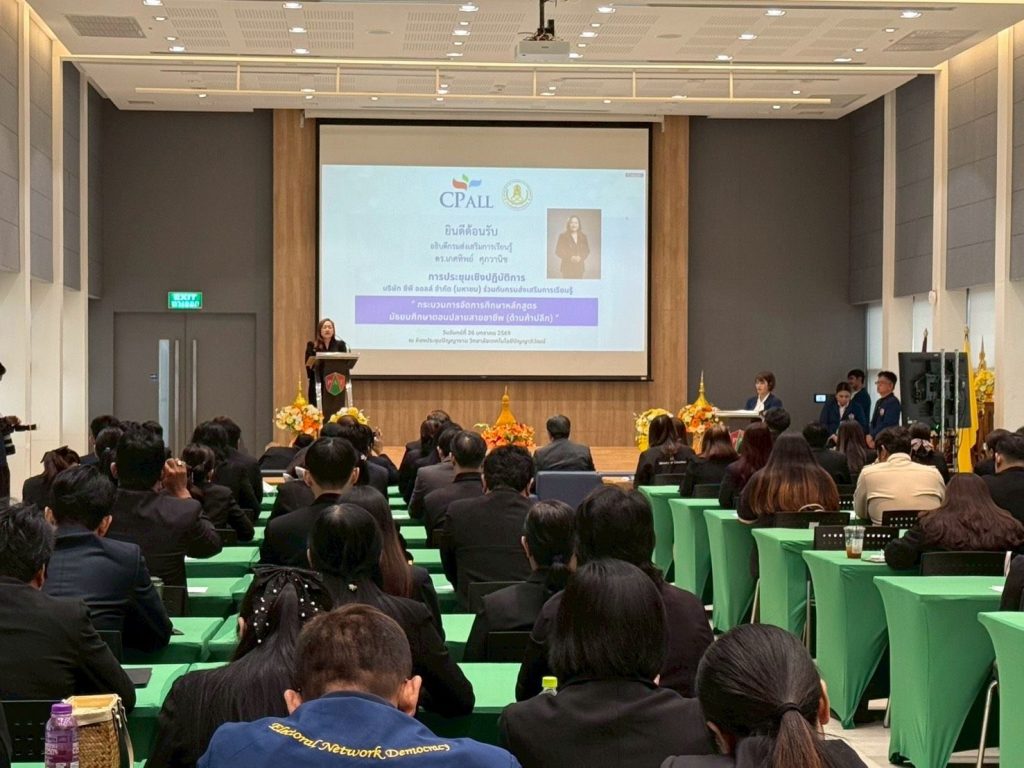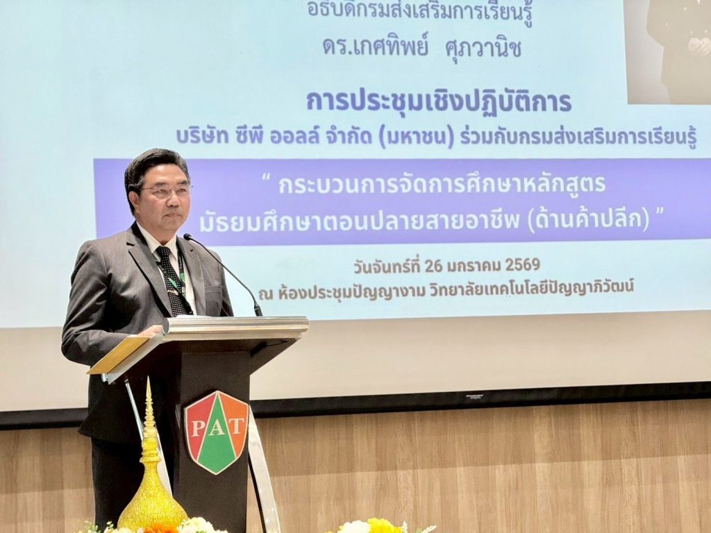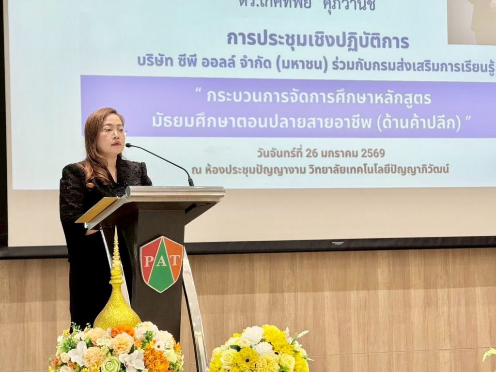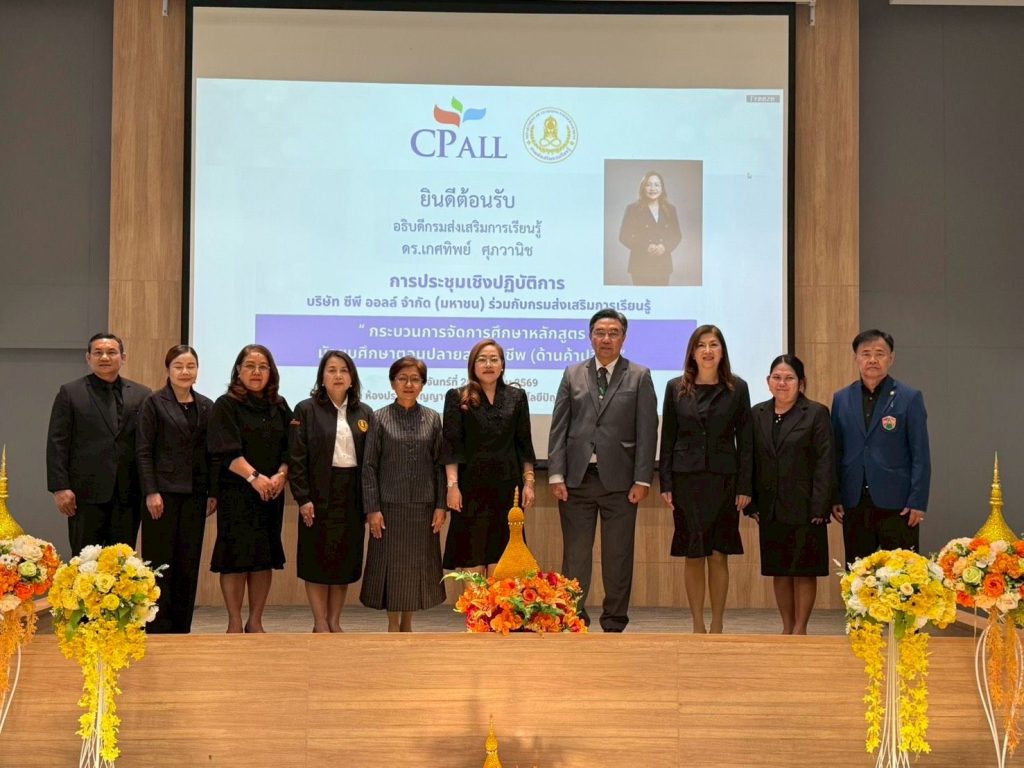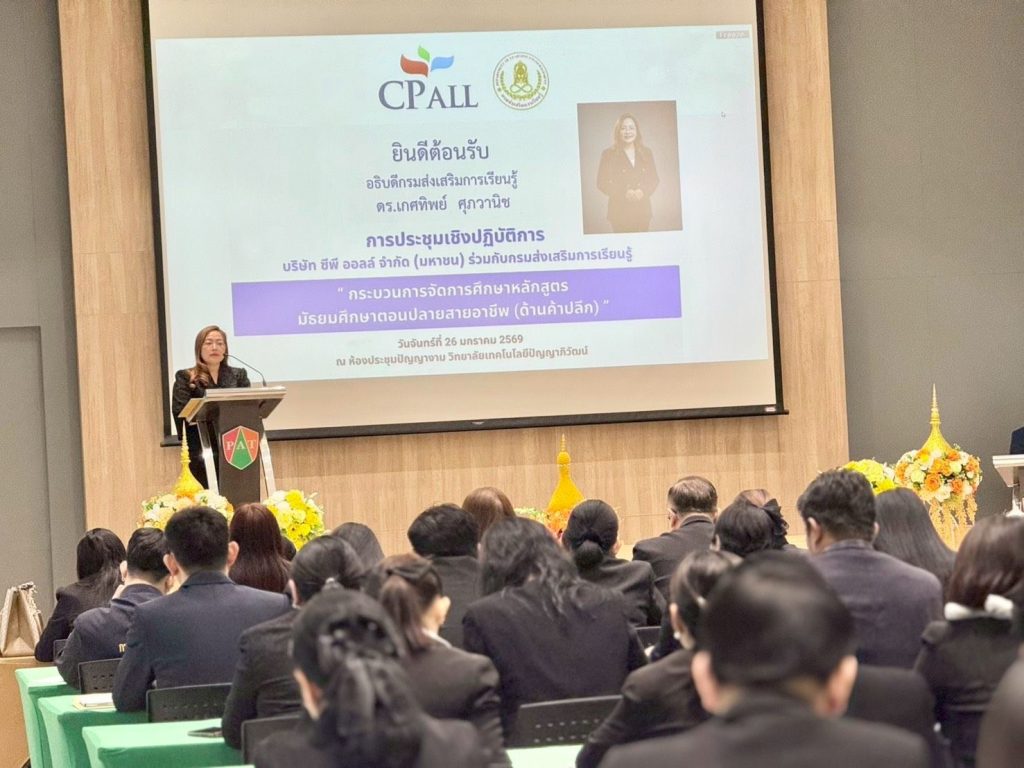 เมื่อวันที่ 26 มกราคม 2569 สกร. ร่วมกับ CP ALL โดยวิทยาลัยเทคโนโลยีปัญญาภิวัฒน์ จัดประชุมเชิงปฏิบัติการเรื่อง “แนวปฏิบัติในการจัดทำผลสัมฤทธิ์ทางการศึกษาหลักสูตรมัธยมศึกษาตอนปลายแผนค้าปลีก และกระบวนการที่เกี่ยวข้อง” ณ ห้องประชุมปัญญางาม ชั้น 5 วิทยาลัยเทคโนโลยีปัญญาภิวัฒน์ จังหวัดนนทบุรี โดยจัดในรูปแบบผสมผสานทั้งแบบ Onsite และ Online ผ่านระบบ Microsoft Teams