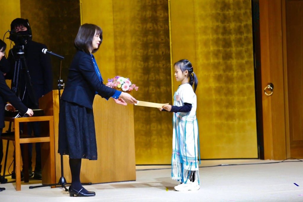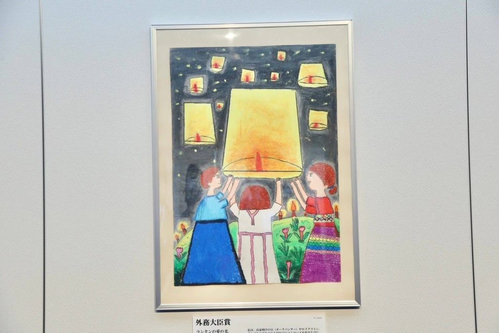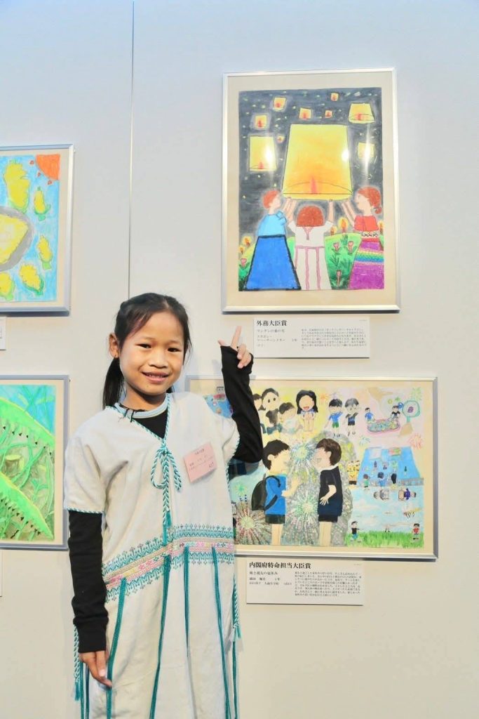 ผลงานที่ได้รับรางวัลในครั้งนี้ คือภาพวาดชื่อ “แสงแห่งรักใต้โคมไฟ” ของเด็กหญิงสุขพร มหาศาลเมธา นักเรียนชั้นประถมศึกษาปีที่ 3 จากศูนย์การเรียนชุมชนชาวไทยภูเขา “แม่ฟ้าหลวง” บ้านมอตะหลั่ว อำเภออุ้มผาง จังหวัดตาก ซึ่งสามารถคว้ารางวัลชนะเลิศระดับนานาชาติ รางวัลรัฐมนตรีว่าการกระทรวงการต่างประเทศญี่ปุ่น จากผลงานที่ส่งเข้าประกวดจากเด็กนักเรียนทั่วโลกกว่า 169,613 ผลงาน
