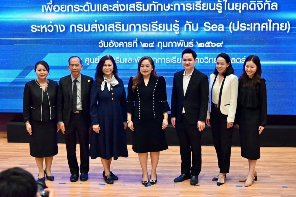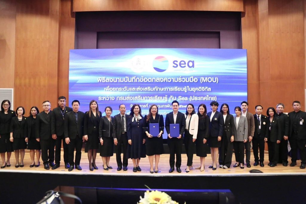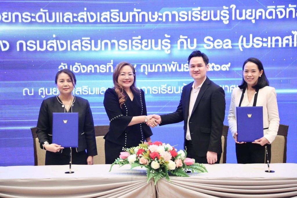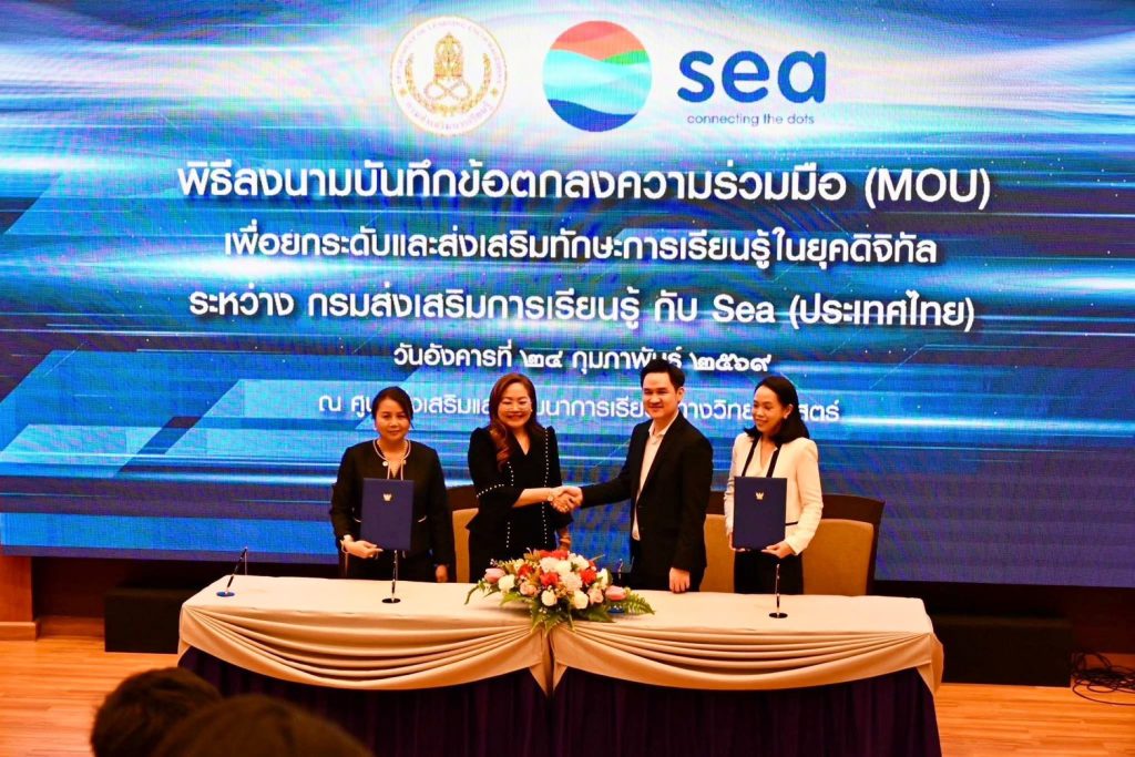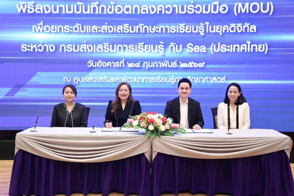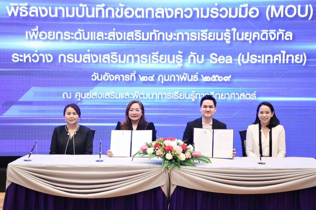 กรมส่งเสริมการเรียนรู้ (สกร.) ผนึกกำลัง Sea (ประเทศไทย) ผู้ให้บริการแพลตฟอร์มดิจิทัลชั้นนำ อาทิ Garena, Shopee และ Monee ลงนามบันทึกข้อตกลงความร่วมมือ (MOU) จัดทำโครงการส่งเสริมการเรียนรู้ทักษะยุคดิจิทัล เพื่อยกระดับทักษะการเงินและการเป็นผู้ประกอบการดิจิทัลให้แก่ครูในสังกัด สกร. กว่า 600 คน ภายในปี 2569 โดยจัดขึ้น ณ ศูนย์ส่งเสริมและพัฒนาการเรียนรู้ทางวิทยาศาสตร์ (ท้องฟ้าจำลอง กรุงเทพฯ)