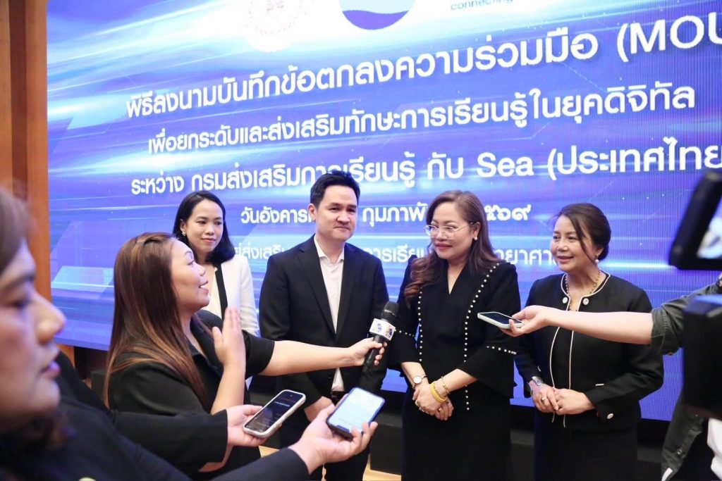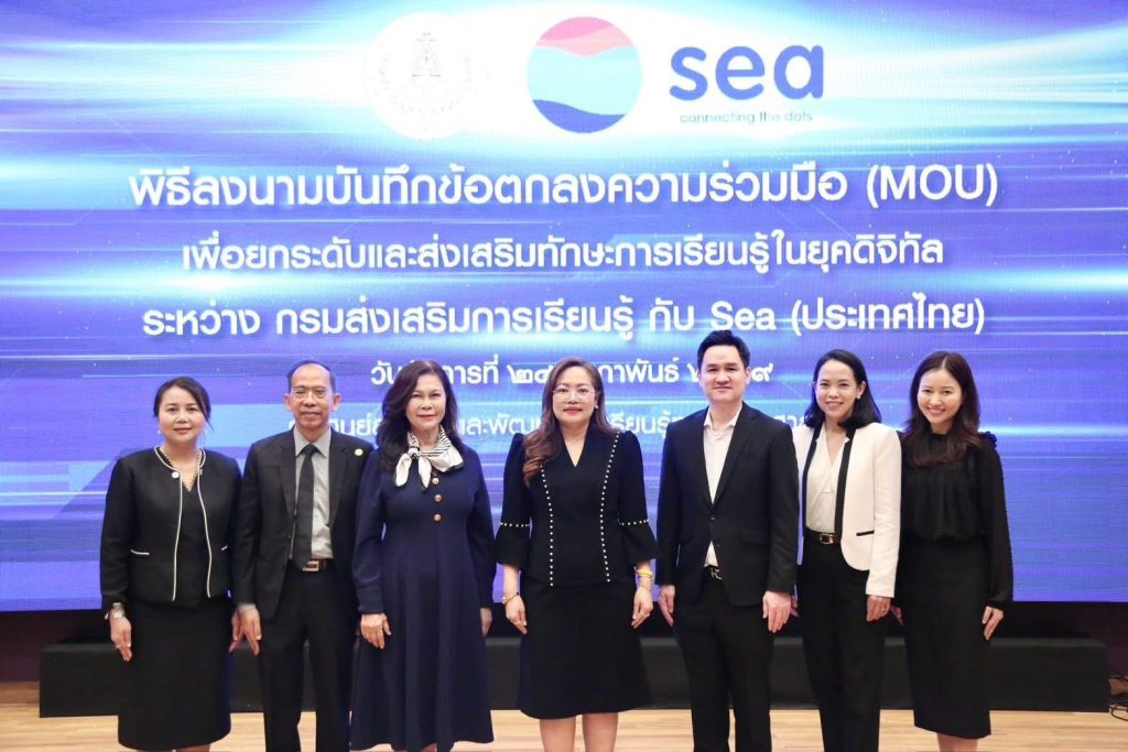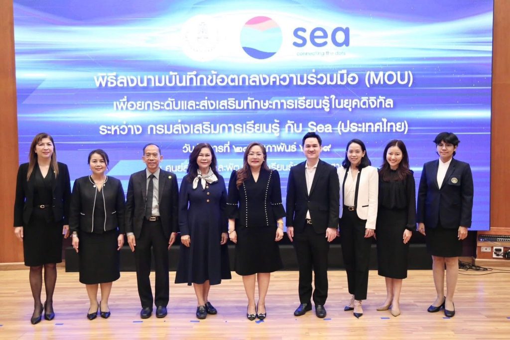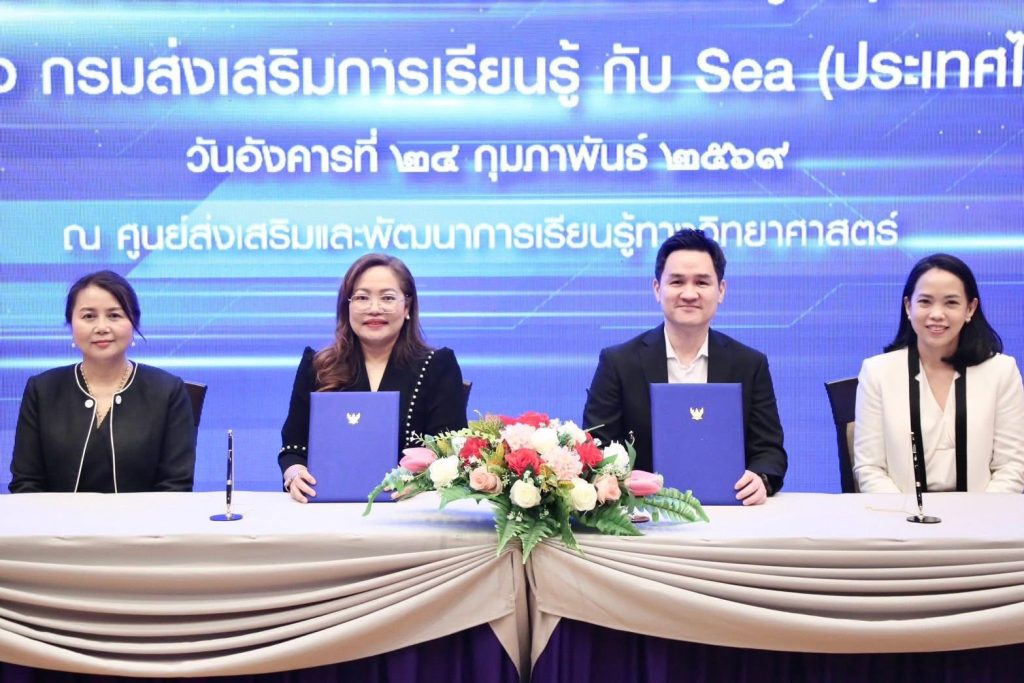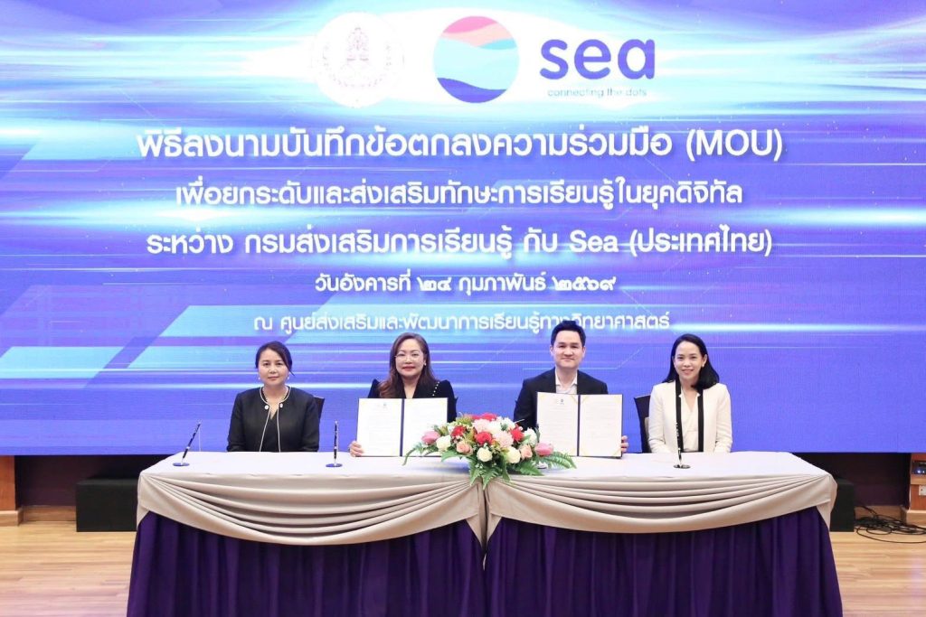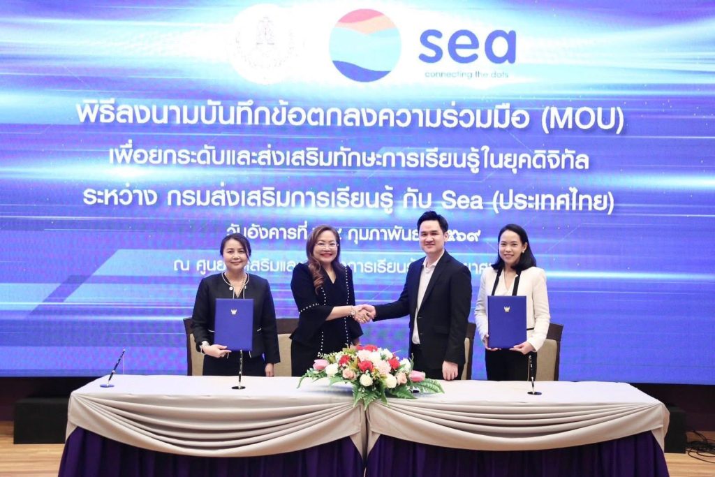 กรมส่งเสริมการเรียนรู้ (สกร.) ผนึกกำลัง Sea (ประเทศไทย) ผู้ให้บริการแพลตฟอร์มดิจิทัลชั้นนำ อาทิ Garena, Shopee และ Monee ลงนามบันทึกข้อตกลงความร่วมมือ (MOU) จัดทำโครงการส่งเสริมการเรียนรู้ทักษะยุคดิจิทัล เพื่อยกระดับทักษะการเงินและการเป็นผู้ประกอบการดิจิทัลให้แก่ครูในสังกัด สกร. กว่า 600 คน ภายในปี 2569 โดยจัดขึ้น ณ ศูนย์ส่งเสริมและพัฒนาการเรียนรู้ทางวิทยาศาสตร์ (ท้องฟ้าจำลอง กรุงเทพฯ)