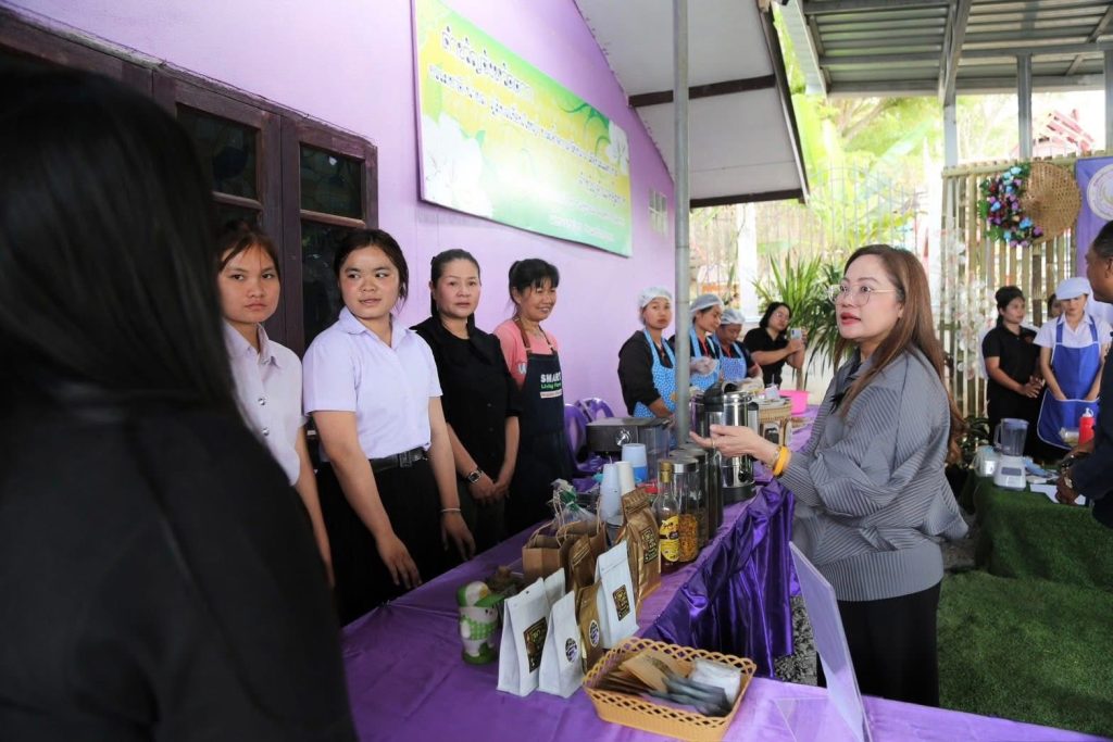 ในช่วงบ่าย อธิบดีได้ตรวจเยี่ยมและให้กำลังใจผู้บริหาร บุคลากร และนักศึกษา สกร. ระดับอำเภออุ้มผาง ซึ่งได้จัดกิจกรรมนำเสนอผลงานและผลิตภัณฑ์จากการฝึกอาชีพ อาทิ ลอดช่องมะพร้าวเต่า ตะโก้มะพร้าวเต่า ข้าวแคบ ถั่วคั่วทราย กาแฟกลุ่มวิสาหกิจชุมชนโมโกร ยำเส้นบุก กล้วยวาฟเฟิล ศิลปะบนผืนผ้า และงานสานตะกร้า สะท้อนให้เห็นถึงการนำความรู้ไปต่อยอดสร้างรายได้ในระดับครัวเรือนและชุมชน