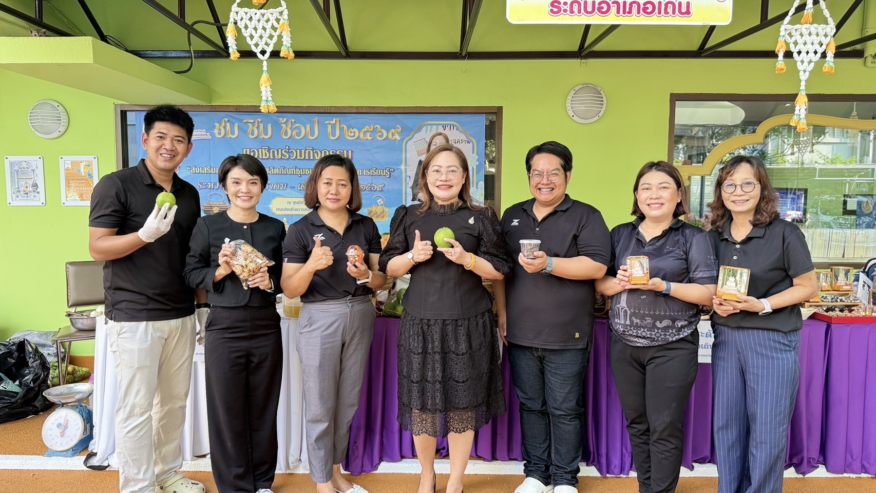 ในการนี้ ได้เยี่ยมชมบูธของศูนย์ส่งเสริมการเรียนรู้ระดับอำเภอเถิน สังกัดสำนักงานส่งเสริมการเรียนรู้ประจำจังหวัดลำปาง ซึ่งได้นำผลิตภัณฑ์ท้องถิ่นที่หลากหลายมาจัดแสดง อาทิ แก้วโป่งข่า น้ำส้มเกลี้ยง ข้าวแต๋น ถั่วเคลือบ กระเป๋าแฮนด์เมด กระเทียมดอง ข้าวโพดต้น และแคบหมู ซึ่งสะท้อนถึงภูมิปัญญาท้องถิ่นและศักยภาพของผู้เรียนในการต่อยอดองค์ความรู้สู่การสร้างอาชีพ